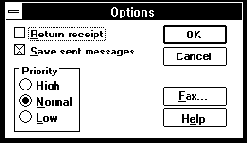 В диалоговой панели "Options" вы можете задать приоритет приложения, передающего факсимильное сообщение. Для этого переведите переключатель "Priority" в соответствующее положение. Положение High устанавливает наивысший приоритет, Normal - стандартный и Low - низкий приоритеты.